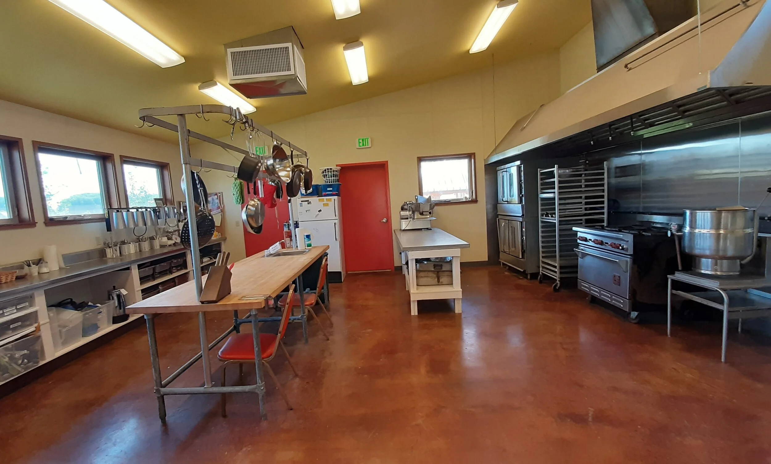 The kitchen building and equipment meets specifications for licensed food production. It includes an industrial gas range, reach-in cooler, triple sink and is fully stocked with pots, pans and kitchen tools. It can be used during Longhouse events and is a hub for cooking during Tamkaliks weekend. It is available for community use as well, as a commercial kitchen or to cater events at the Dance Arbor.